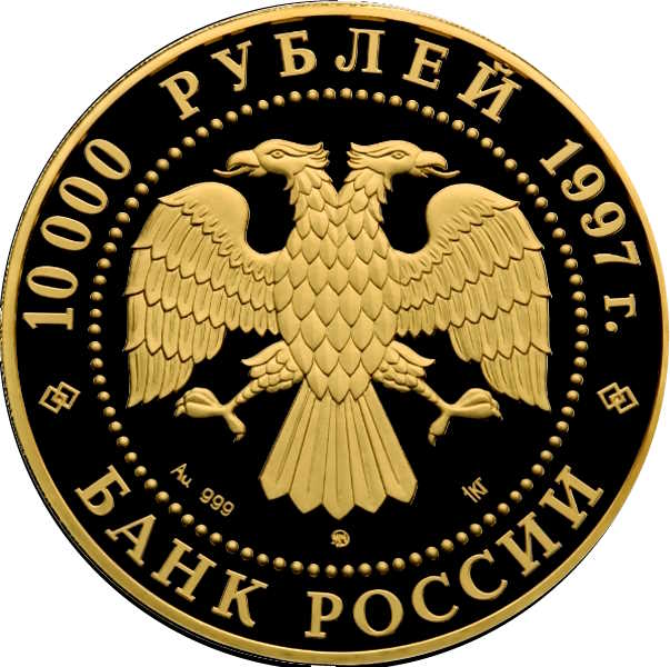 Описание: Двоголовий орел, створений художником І. Білібіним. Написи по краю: зверху — «10 000 РУБЛЕЙ 1997 г.» (10 000 РУБЛІВ 1997), знизу — «БАНК РОССИИ» (БАНК РОСІЇ). Літери нижче позначають металевий знак, пробу, вміст дорогоцінного металу та знак монетного двору.