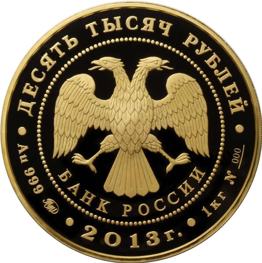 Описание: У центрі — емблема Банку Росії [двоголовий орел із розпростертими крилами, під ним — напівкруглий напис «БАНК РОССИИ» (БАНК РОСІЇ)], обрамлена колом з крапок і написів, зверху — номінал: «ДЕСЯТЬ ТЫСЯЧ РУБЛЕЙ» (ДЕСЯТЬ ТИСЯЧ РУБЛІВ), нижче: ліворуч - позначення дорогоцінного металу, його проби та клеймо монетного двору, в центрі - рік випуску «2013 г.» (2013), праворуч - вміст дорогоцінного металу та порядковий номер монети №___.