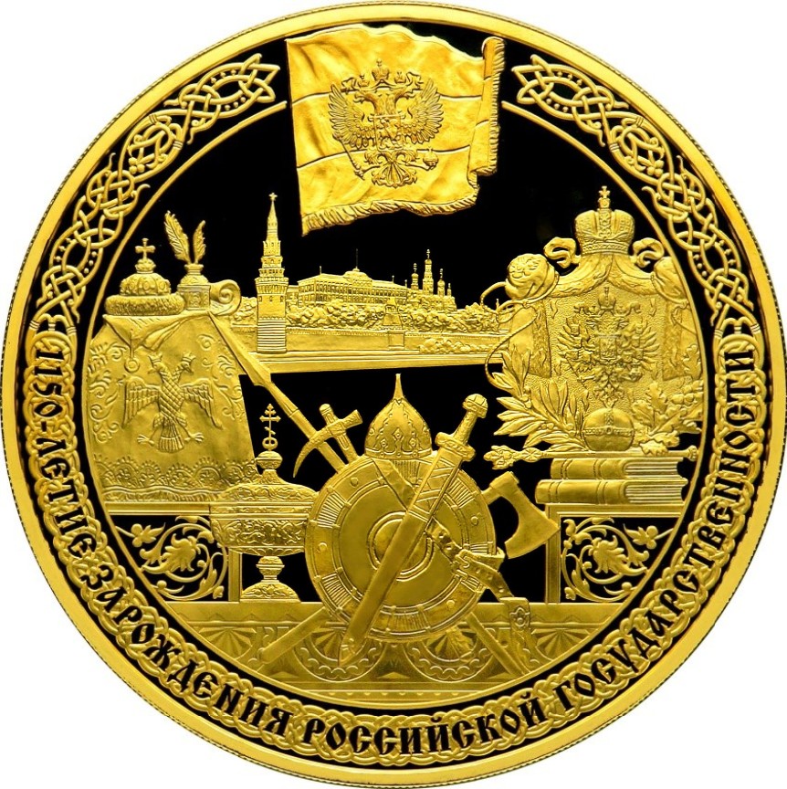 Описание: На передньому плані — стародавня зброя: щит, молот, спис, зуб, сокира, ліворуч — посудина для церковної служби, за ними ліворуч — на постаменті — шапка Мономаха на запечатаному рукописі та набір для письма, на лицьовій стороні постаменту — зображення двоголового орла Івана III, праворуч на двох томах — скіпетр, регалія і зображення Малого державного герба Російської імперії в декоративній рамці з короною Катерини II над ним, на задньому плані - вид Московського Кремля, над ним - Прапор Президента Російської Федерації; на широкій смузі, утвореній обідком і концентричною лінією кола, - напис, що йде зліва вниз і вправо: «1150-ЛЕТИЕ ЗАРОЖДЕНИЯ РОССИЙСКОЙ ГОСУДАРСТВЕННОСТИ» (1150-РІЧЧЯ ЗАРОДЖЕННЯ РОСІЙСЬКОЇ ДЕРЖАВНОСТІ), у верхній частині смуги — орнаменти з хвилястих ліній.