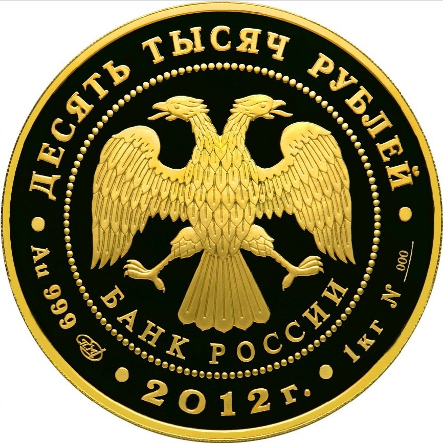 Описание: У центрі — емблема Банку Росії [двоголовий орел із розпростертими крилами, під ним — напівкруглий напис «БАНК РОССИИ» (БАНК РОСІЇ)], обрамлена колом з крапок і написів, зверху — номінал: «ДЕСЯТЬ ТЫСЯЧ РУБЛЕЙ» (ДЕСЯТЬ ТИСЯЧ РУБЛІВ), нижче: ліворуч - позначення дорогоцінного металу, його проби та знак монетного двору, в центрі - рік випуску «2012 г.» (2012), праворуч - вміст дорогоцінного металу та порядковий номер монети №___.