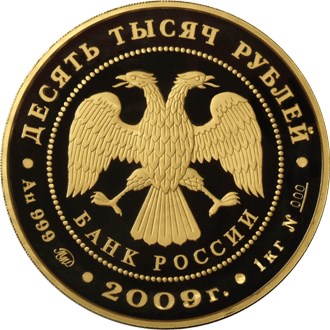 Описание: У центрі — емблема Банку Росії [двоголовий орел із розпростертими крилами, під ним — напівкруглий напис «БАНК РОССИИ» (БАНК РОСІЇ)] в обрамленні кола з крапок і написів, зверху — номінал: «ДЕСЯТЬ ТЫСЯЧ РУБЛЕЙ» (ДЕСЯТЬ ТИСЯЧ РУБЛІВ), нижче: ліворуч - позначення дорогоцінного металу, його проби та клеймо монетного двору, в центрі - рік випуску «2009 г.» (2009), праворуч - вміст дорогоцінного металу та порядковий номер монети №___.