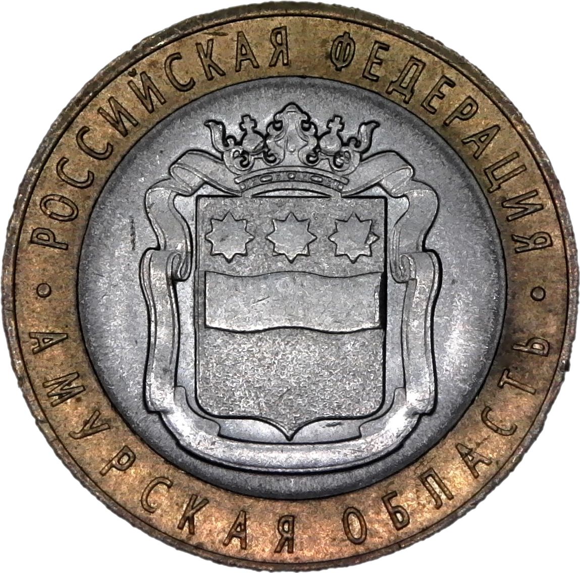 Описание: На зворотному боці монети зображено емблему Бєлгородської області, розміщену на диску. По колу на кільці розміщені написи: «РОССИЙСКАЯ ФЕДЕРАЦИЯ» (РОСІЙСЬКА ФЕДЕРАЦІЯ) зверху та «АМУРСКАЯ ОБЛАСТЬ» (АМУРСЬКА ОБЛАСТЬ) знизу.
