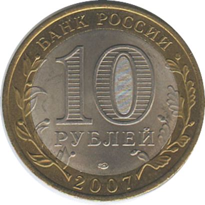 Описание: У центрі диска – позначення номіналу монети «10 РУБЛЕЙ» (10 РУБЛІВ). Усередині цифри «0» – приховані зображення цифри «10» та напису «РУБ» (RUB), які по черзі стають видимими при зміні кута зору. У нижній частині диска – торговельна марка монетного двору. У верхній частині кільця – напис по колу: «БАНК РОССИИ» (БАНК РОСІЇ), у нижній – рік випуску «2007 г.» (2007), ліворуч і праворуч – стилізовані гілки рослин, що переходять на диск.