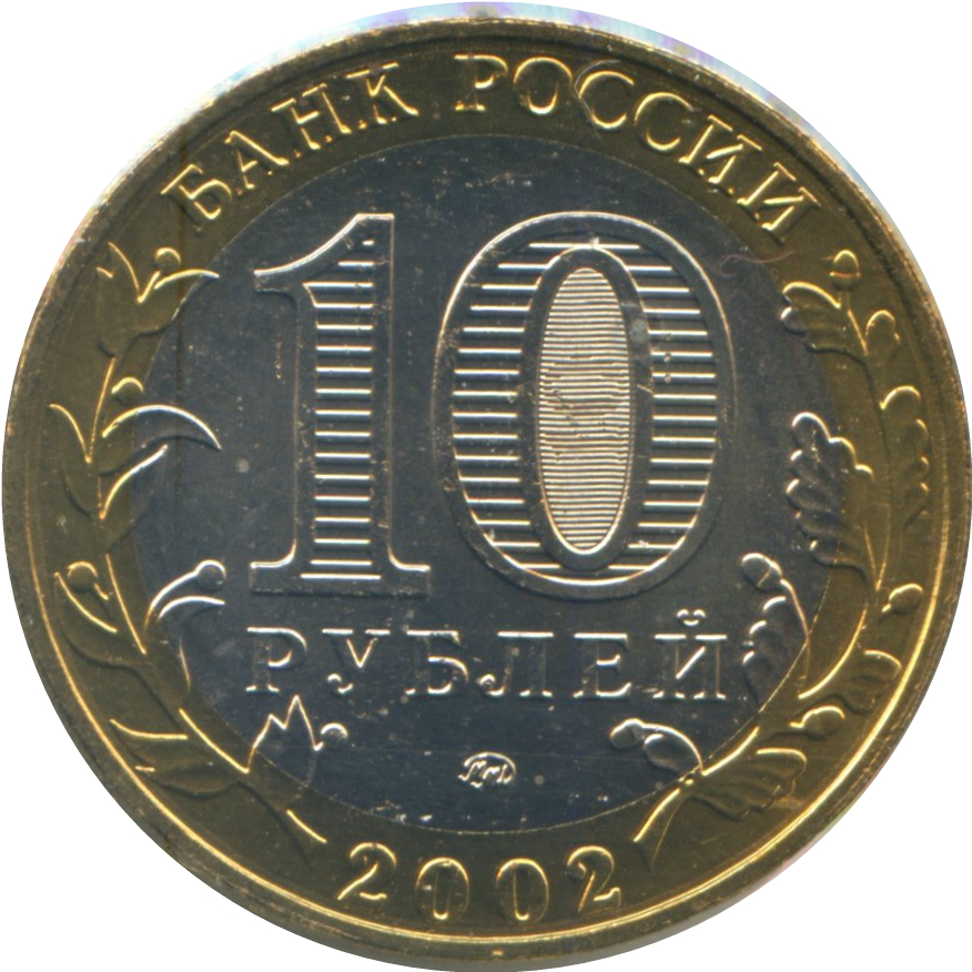 Описание: У центрі — позначення номінальної вартості монети «10 РУБЛЕЙ» (10 РУБЛІВ). Усередині цифри «0» — приховані зображення цифри «10» та напису «РУБ» (RUB), які по черзі видно лише при зміні кута зору. У нижній частині диска — торговельна марка монетного двору. У верхній частині кільця - напис по колу: «БАНК РОССИИ» (БАНК РОСІЇ), у нижній - рік випуску «2002», ліворуч і праворуч - стилізовані гілки рослин, що переходять на диск.