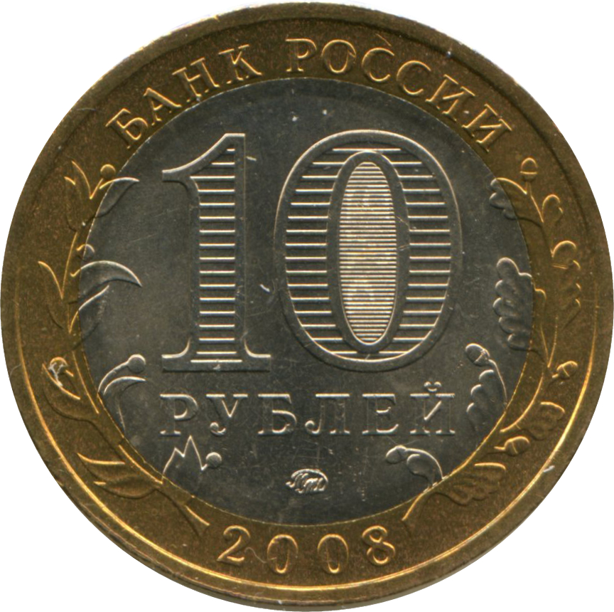 Описание: У центрі диска — позначення номінальної вартості монети «10 РУБЛЕЙ» (10 РУБЛІВ). Усередині цифри «0» — приховані зображення цифри «10» та напису «РУБ» (RUB), які по черзі стають видимими при зміні кута зору. У нижній частині диска — торговельна марка монетного двору. У верхній частині кільця - напис по колу: «БАНК РОССИИ» (БАНК РОСІЇ), у нижній - рік випуску «2008 г.» (2008), ліворуч і праворуч - стилізовані гілки рослин, що переходять на диск.