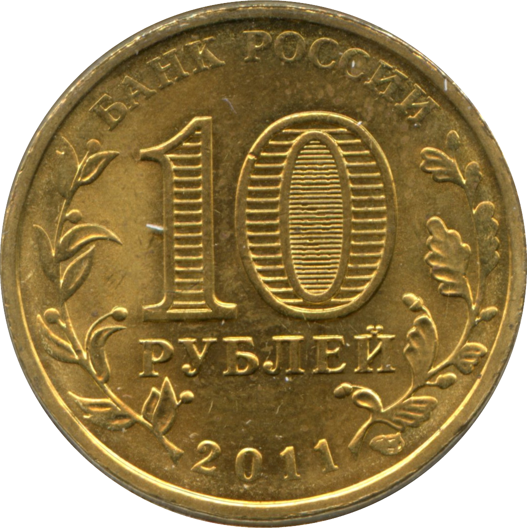 Описание: У центрі диска — позначення номіналу монети «10 РУБЛЕЙ» (10 РУБЛІВ). Усередині цифри «0» — приховані зображення цифри «10» та напису «РУБ» (RUB), які по черзі стають видимими при зміні кута зору. По краю монети розміщено кругові написи: зверху — «БАНК РОССИИ» (БАНК РОСІЇ), знизу — дата «2011», ліворуч — стилізоване зображення оливкової гілки, праворуч — дубової гілки.