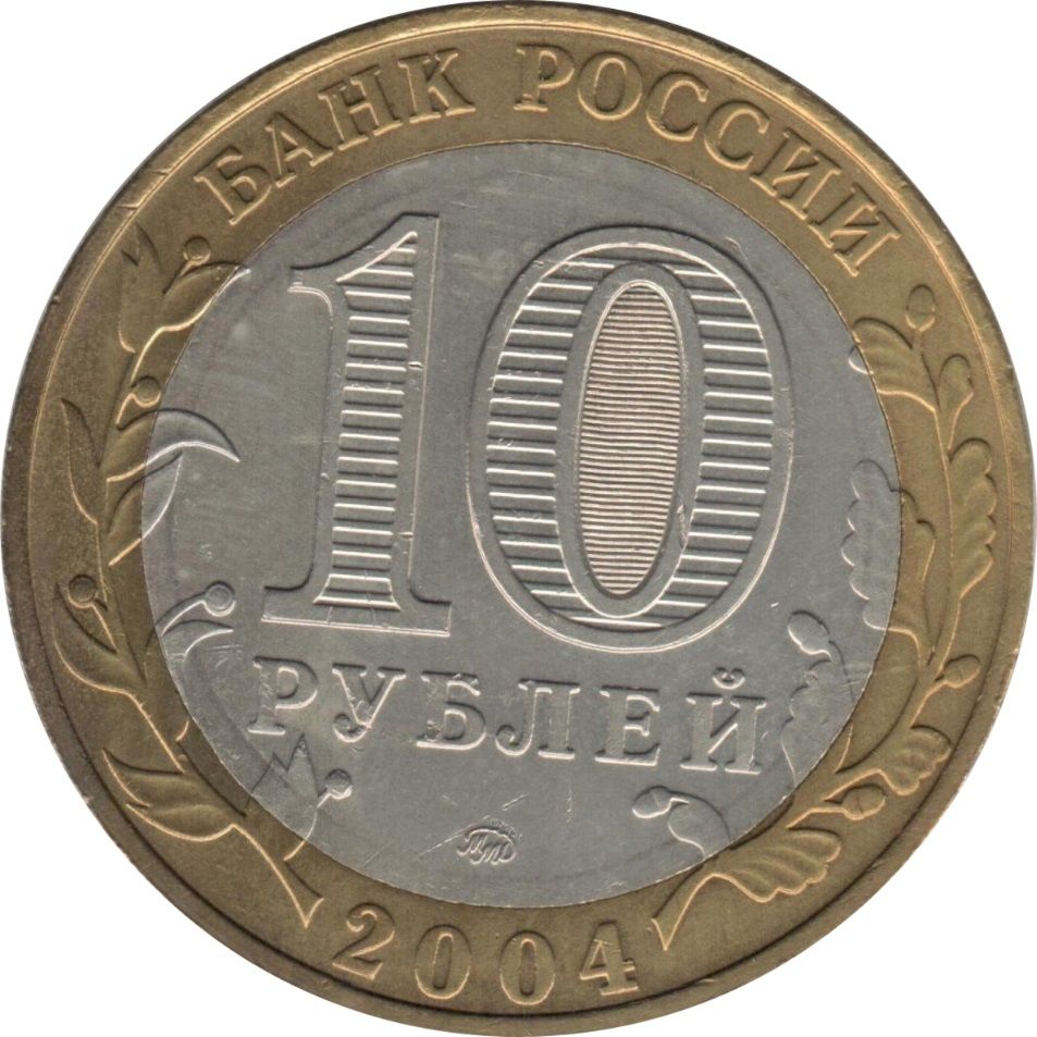 Описание: У центрі – позначення номінальної вартості монети «10 РУБЛЕЙ» (10 РУБЛІВ). Всередині цифри «0» – приховані зображення цифри «10» та напису «РУБ» (RUB), які по черзі видно лише при зміні кута зору. У нижній частині диска – торгова марка монетного двору. У верхній частині кільця – напис по колу: «БАНК РОССИИ» (БАНК РОСІЇ), у нижній – рік випуску «2004», ліворуч і праворуч – стилізовані гілки рослин, що переходять на диск.