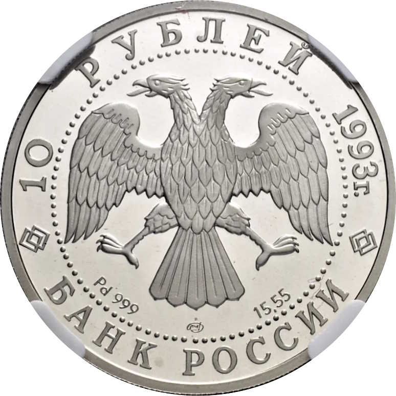 Описание: У центрі — емблема Банку Росії (двоголовий орел, розроблений І. Білібіним), нижче ліворуч — позначка металу та проба, у центрі — знак монетного двору, праворуч — вміст дорогоцінного металу. Написи по колу, обрамленому кругом з крапок: вгорі — «10 рублів 1993», внизу — «БАНК РОСІЇ».
