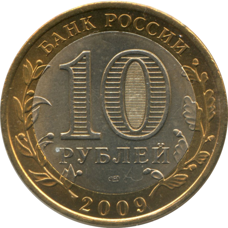 Описание: У центрі диска — позначення номіналу монети «10 РУБЛЕЙ» (10 РУБЛІВ). Усередині цифри «0» — приховані зображення цифри «10» та напису «РУБ» (RUB), які по черзі стають видимими при зміні кута зору. У нижній частині диска — знак монетного двору. У верхній частині кільця - напис по колу: «БАНК РОССИИ» (БАНК РОСІЇ), у нижній - рік випуску «2009», ліворуч і праворуч - стилізовані гілки рослин, що переходять на диск.