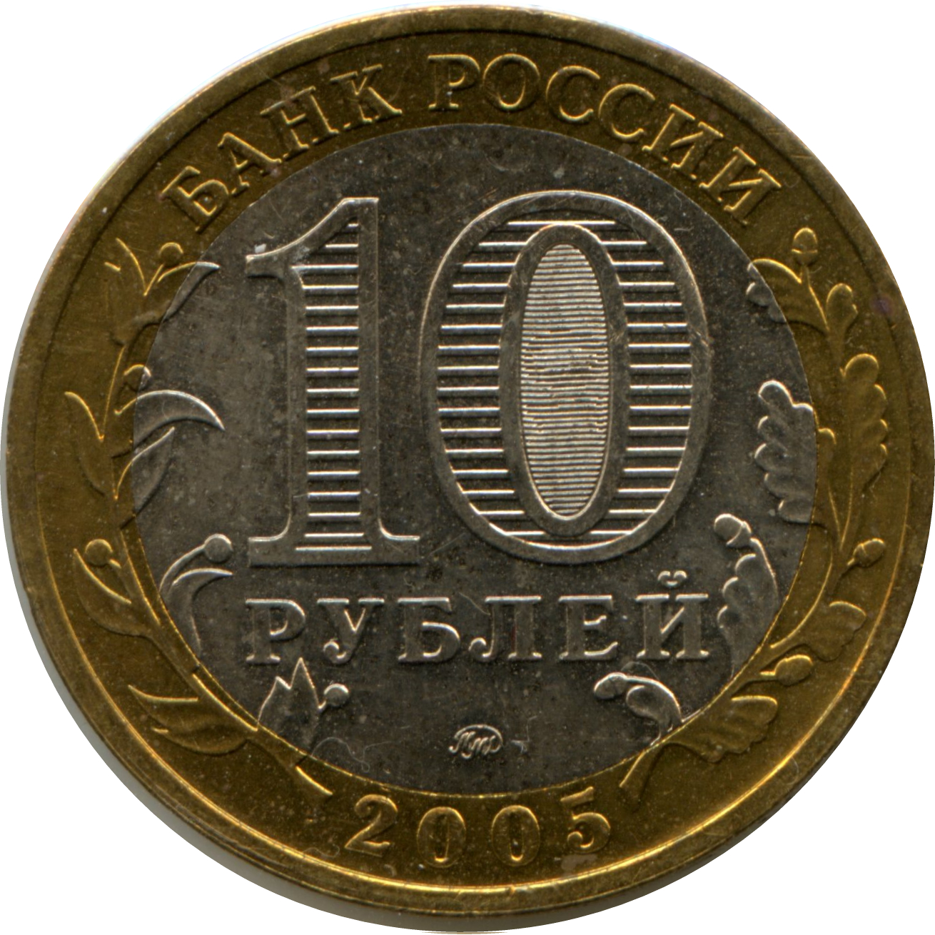 Описание: У центрі – позначення номіналу монети «10 РУБЛЕЙ» (10 РУБЛІВ). Усередині цифри «0» – приховані зображення цифри «10» та напису «РУБ» (RUB), які по черзі видно лише при зміні кута зору. У нижній частині диска – торговельна марка монетного двору. У верхній частині кільця – напис по колу: «БАНК РОССИИ» (БАНК РОСІЇ), у нижній – рік випуску «2005», ліворуч і праворуч – стилізовані гілки рослин, що переходять на диск.