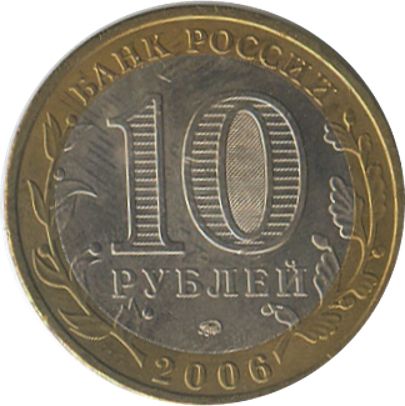 Описание: У центрі – позначення номінальної вартості монети «10 РУБЛЕЙ» (10 РУБЛІВ). Всередині цифри «0» – приховані зображення цифри «10» та напису «РУБ» (RUB), які по черзі видно лише при зміні кута зору. У нижній частині диска – торговельна марка монетного двору. У верхній частині кільця – напис по колу: «БАНК РОССИИ» (БАНК РОСІЇ), у нижній – рік випуску «2006», ліворуч і праворуч – стилізовані гілки рослин, що переходять на диск.