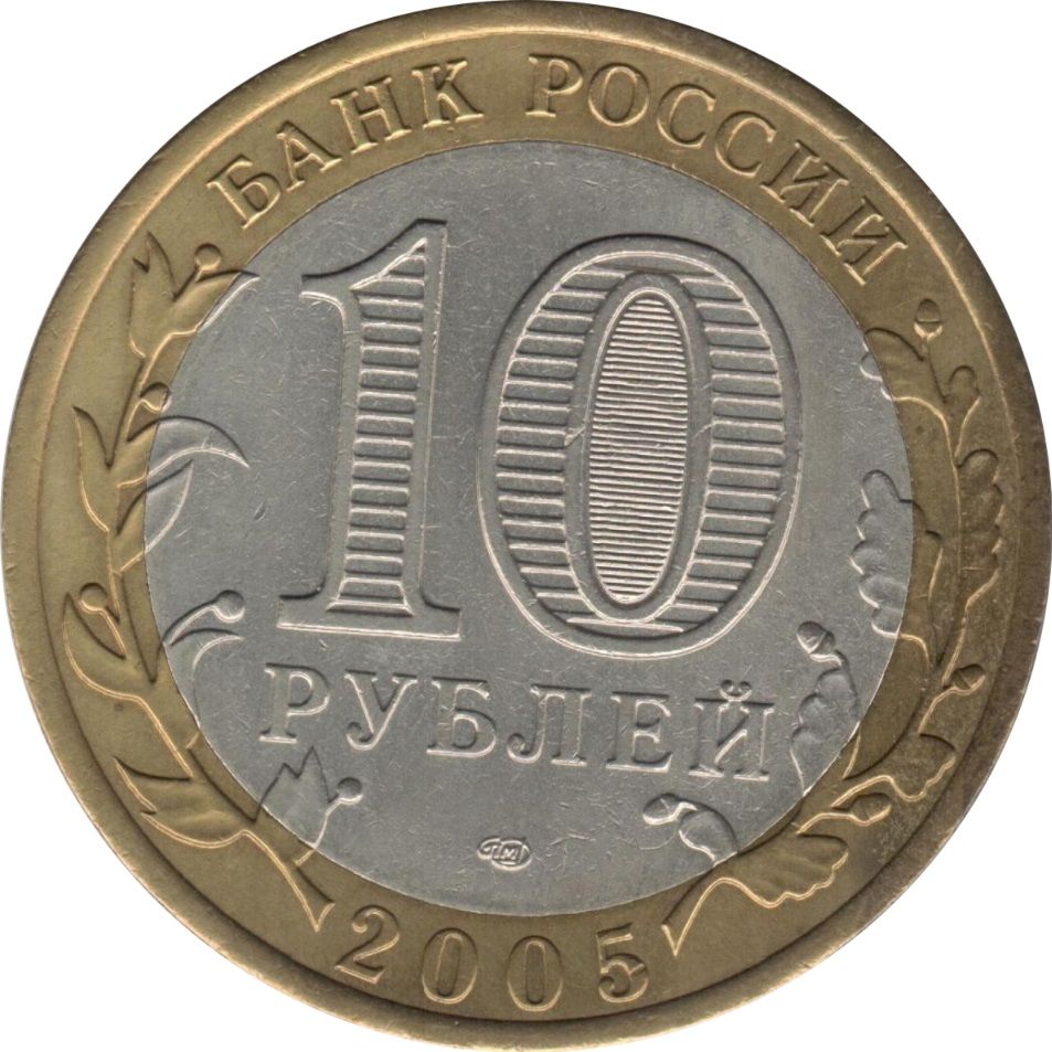 Описание: У центрі – позначення номіналу монети «10 РУБЛЕЙ» (10 РУБЛІВ). Всередині цифри «0» – приховані зображення цифри «10» та напису «РУБ» (RUB), які по черзі видно лише при зміні кута зору. У нижній частині диска – знак монетного двору. У верхній частині кільця – напис по колу: «БАНК РОССИИ» (БАНК РОСІЇ), у нижній – рік випуску «2005», ліворуч і праворуч – стилізовані гілки рослин, що переходять на диск.