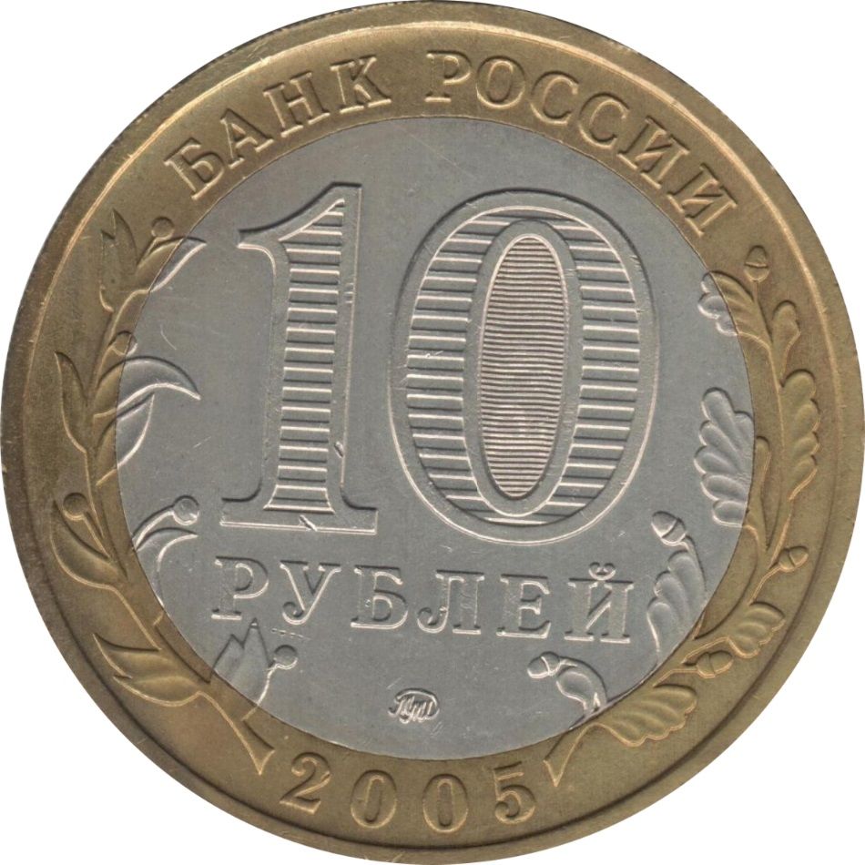 Описание: У центрі – позначення номіналу монети «10 РУБЛЕЙ» (10 РУБЛІВ). Усередині цифри «0» – приховані зображення цифри «10» та напису «РУБ» (RUB), які по черзі видно лише при зміні кута зору. У нижній частині диска – торговельна марка монетного двору. У верхній частині кільця – напис по колу: «БАНК РОССИИ» (БАНК РОСІЇ), у нижній – рік випуску «2005», ліворуч і праворуч – стилізовані гілки рослин, що переходять на диск.
