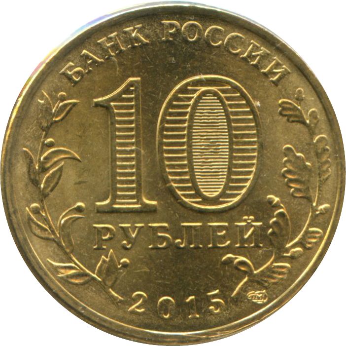 Описание: У центрі – позначення номіналу монети «10 РУБЛЕЙ» (10 РУБЛІВ). Всередині цифри «0» – приховані зображення цифри «10» та напису «РУБ» (RUB), які по черзі стають видимими при зміні кута зору. По краю – кругові написи, зверху: «БАНК РОССИИ» (БАНК РОСІЇ), знизу – дата: «2015», ліворуч – стилізоване зображення лаврової гілки, праворуч – дубової.