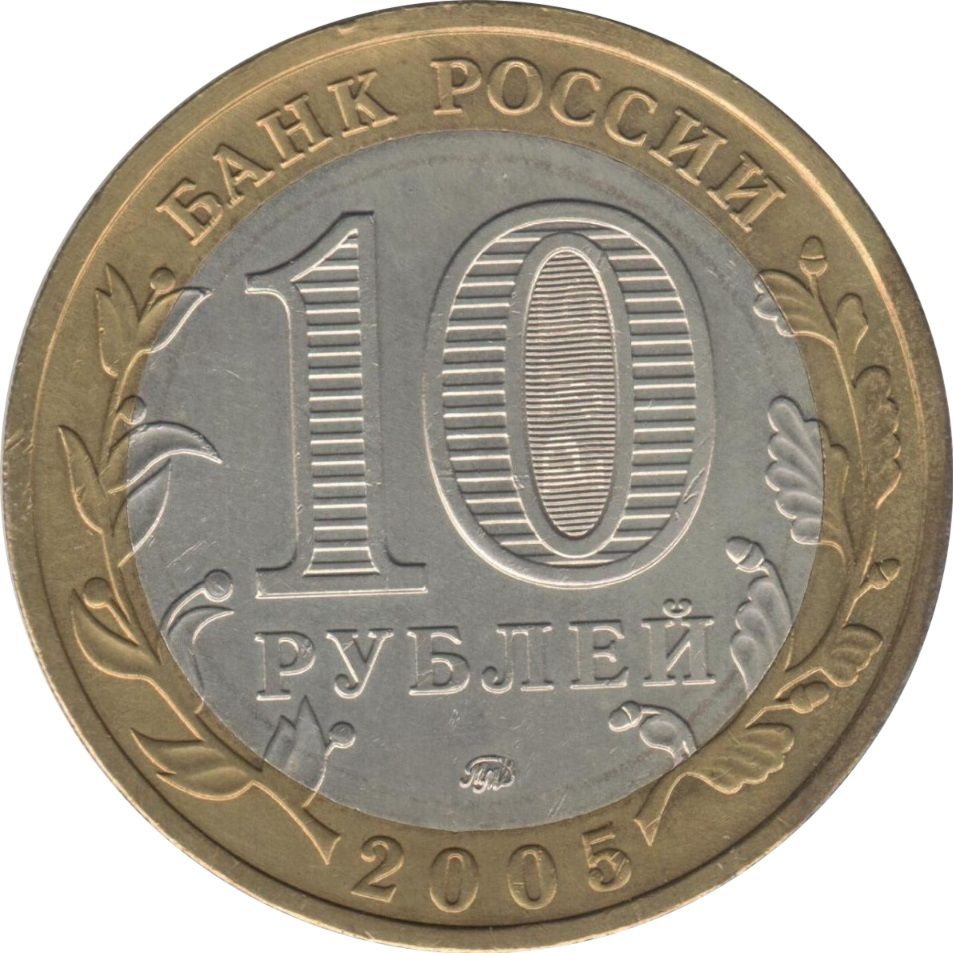 Описание: У центрі – позначення номінальної вартості монети «10 РУБЛЕЙ» (10 РУБЛІВ). Всередині цифри «0» – приховані зображення цифри «10» та напису «РУБ» (RUB), які по черзі видно лише при зміні кута зору. У нижній частині диска – торговельна марка монетного двору. У верхній частині кільця – напис по колу: «БАНК РОССИИ» (БАНК РОСІЇ), у нижній – рік випуску «2005», ліворуч і праворуч – стилізовані гілки рослин, що переходять на диск.