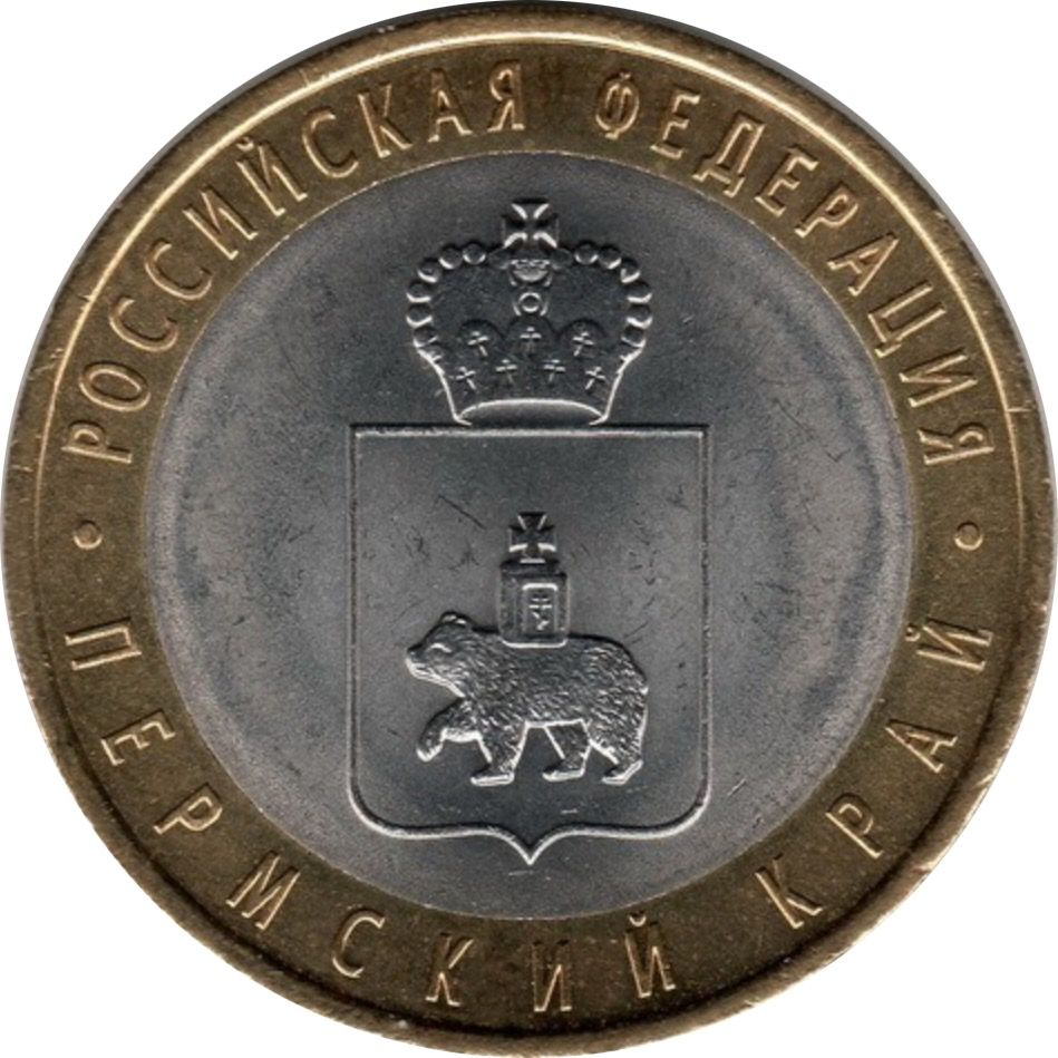 Описание: Зображення герба Пермського краю. Написи по краю: зверху — «РОССИЙСКАЯ ФЕДЕРАЦИЯ» (РОСІЙСЬКА ФЕДЕРАЦІЯ), знизу — «ПЕРМСКИЙ КРАЙ» (ПЕРМСЬКИЙ КРАЙ).
