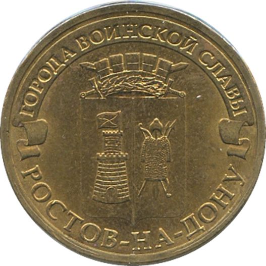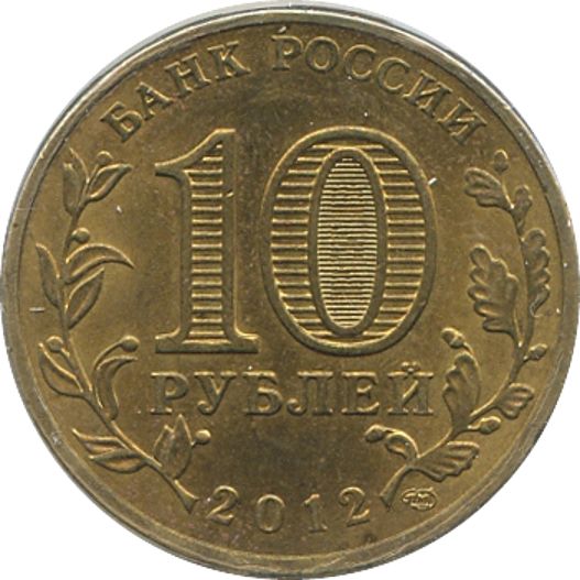 Описание: У центрі диска — позначення номінальної вартості монети «10 РУБЛЕЙ» (10 РУБЛІВ). Усередині цифри «0» — приховані зображення цифри «10» та напису «РУБ» (RUB), які по черзі стають видимими при зміні кута зору. По краю монети розміщено кругові написи: зверху — «БАНК РОССИИ» (БАНК РОСІЇ), знизу — дата «2012», ліворуч — стилізоване зображення оливкової гілки, праворуч — дубової гілки.