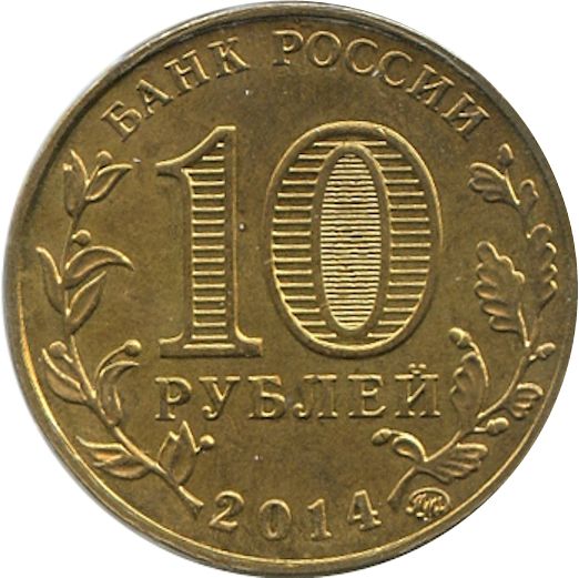 Описание: У верхній частині монети вздовж краю розміщено напис: «БАНК РОССИИ» (БАНК РОСІЇ), у нижній частині — рік випуску «2014». Зліва та справа розміщено стилізовані зображення лаврової та дубової гілок відповідно. У центрі диска двома рядками вказано номінал монети «10 РУБЛЕЙ» (10 РУБЛІВ). Усередині цифри «0» розташований захисний елемент у вигляді цифри «10» і напис «РУБ» (RUB), який стає видимим при зміні кута зору. У нижній частині диска розміщений знак монетного двору.