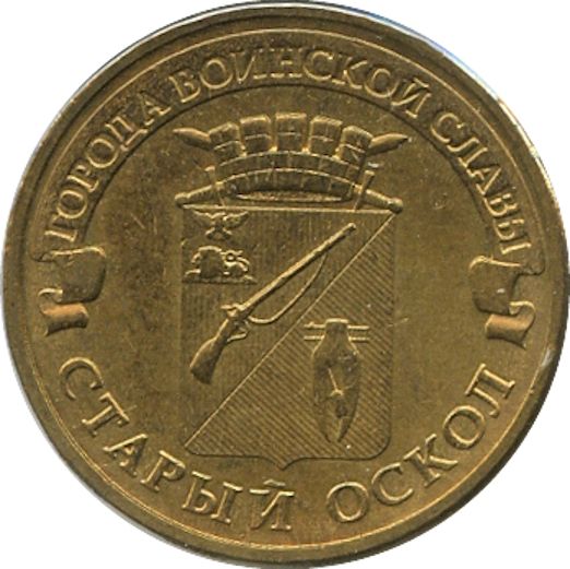 Описание: На зворотному боці монети зображено рельєфне зображення герба Старого Оскола. По периметру розміщені написи — «ГОРОДА ВОИНСКОЙ СЛАВЫ» (МІСТА ВОЄННОЇ СЛАВИ) у верхній частині та «СТАРЫЙ ОСКОЛ» (СТАРИЙ ОСКОЛ) у нижній частині.