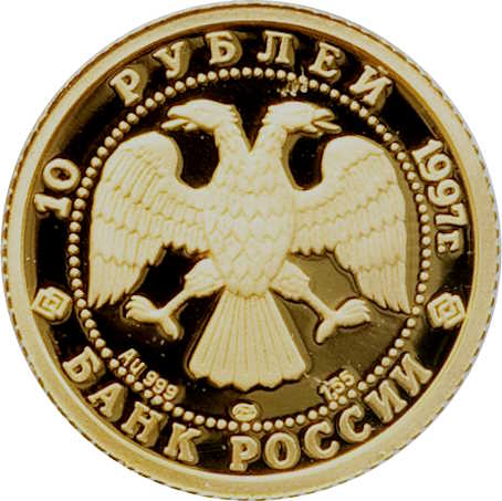 Описание: Двоголовий орел, створений художником І. Білібіним. Написи по краю: зверху — «10 РУБЛЕЙ 1997 г.» (10 РУБЛІВ 1997), знизу — «БАНК РОССИИ» (БАНК РОСІЇ). Літери нижче позначають металевий знак, пробу, вміст дорогоцінного металу та знак монетного двору.