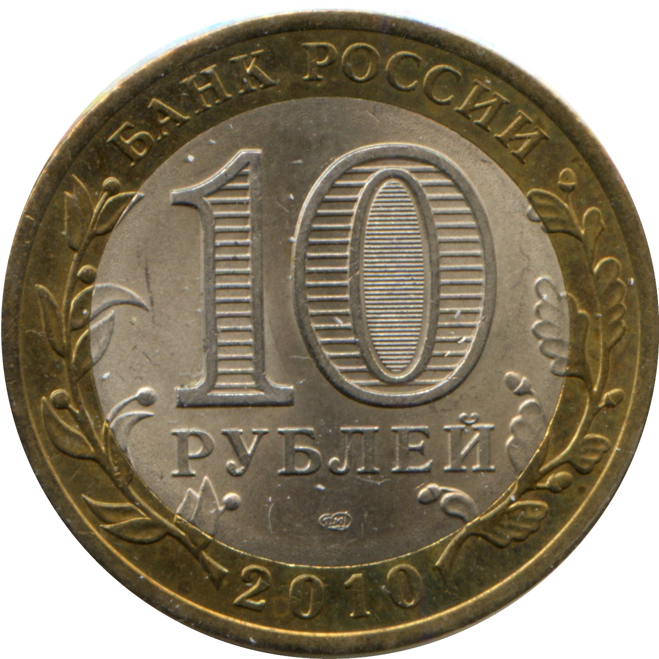 Описание: У центрі диска — позначення номіналу монети «10 РУБЛЕЙ» (10 РУБЛІВ). Усередині цифри «0» — приховані зображення цифри «10» та напису «РУБ», які по черзі стають видимими при зміні кута зору. У нижній частині диска — знак монетного двору. У верхній частині кільця - напис по колу: «БАНК РОССИИ» (БАНК РОСІЇ), у нижній - рік випуску «2010», ліворуч і праворуч - стилізовані гілки рослин, що переходять на диск.