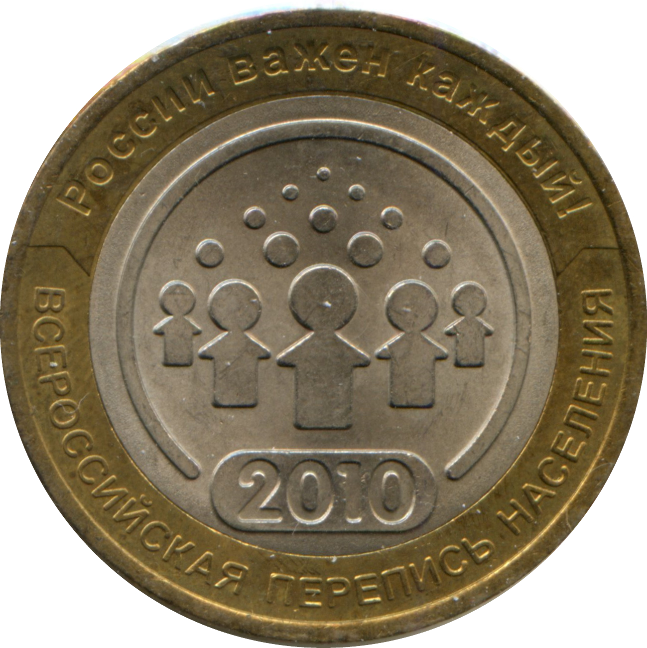 Описание: У центрі — емблема Всеросійського перепису населення з датою «2010», на кільці — написи вздовж краю, зверху: «РОССИИ ВАЖЕН КАЖДЫЙ» (ДЛЯ РОСІЇ ВАЖЛИВИЙ КОЖЕН), знизу: «ВСЕРОССИЙСКАЯ ПЕРЕПИСЬ НАСЕЛЕНИЯ» (ВСЬОРОСІЙСЬКИЙ ПЕРЕПИС НАСЕЛЕННЯ).