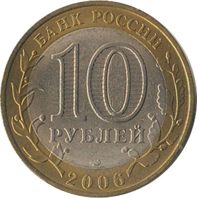 Описание: У центрі – позначення номінальної вартості монети «10 РУБЛЕЙ» (10 РУБЛІВ). Усередині цифри «0» – приховані зображення цифри «10» та напису «РУБ» (RUB), які по черзі видно лише при зміні кута зору. У нижній частині диска – торговельна марка монетного двору. У верхній частині кільця – напис по колу: «БАНК РОССИИ» (БАНК РОСІЇ), у нижній – рік випуску «2006», ліворуч і праворуч – стилізовані гілки рослин, що переходять на диск.