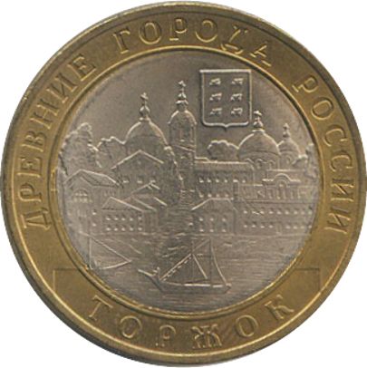 Описание: Зображення панорами міста на березі річки, над ним — герб Торжка. Написи по краю: зверху — «ДРЕВНИЕ ГОРОДА РОССИИ» (СТАРОДАВНІ МІСТА РОСІЇ), знизу — «ТОРЖОК».