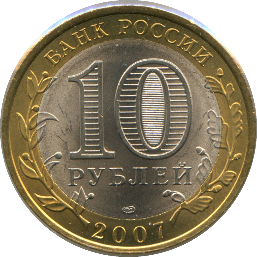 Описание: У центрі диска — позначення номінальної вартості монети «10 РУБЛЕЙ» (10 РУБЛІВ). Усередині цифри «0» — приховані зображення цифри «10» та напису «РУБ» (RUB), які по черзі стають видимими при зміні кута зору. У нижній частині диска — знак монетного двору. У верхній частині кільця — напис по колу: «БАНК РОССИИ» (БАНК РОСІЇ), у нижній — рік випуску «2007 г.» (2007), ліворуч і праворуч — стилізовані гілки рослин, що переходять на диск.