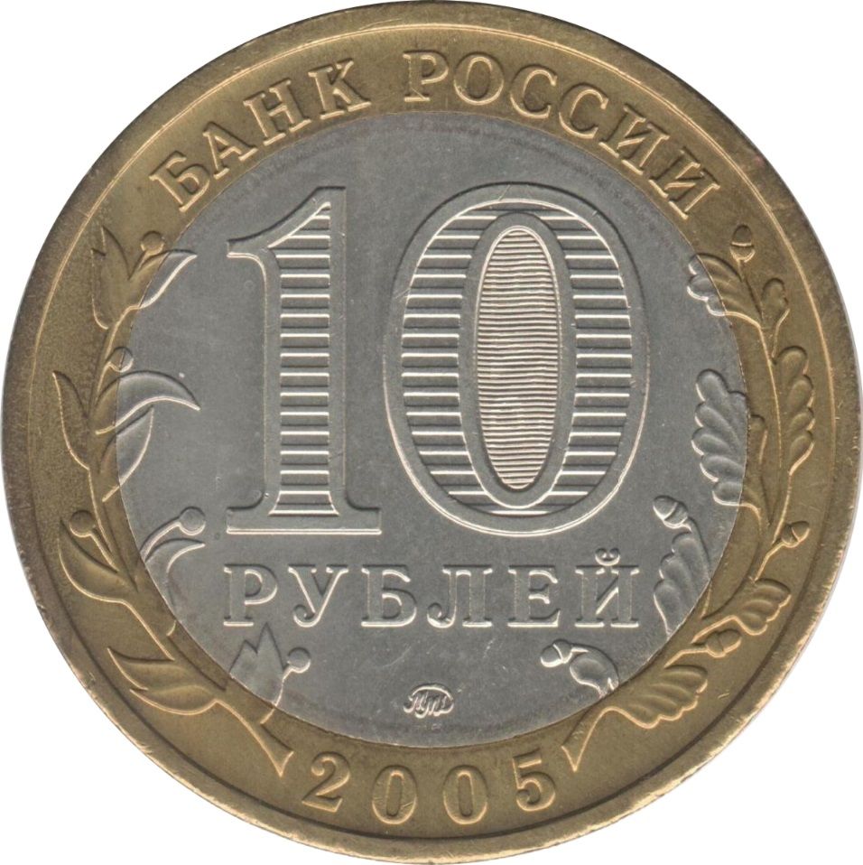 Описание: У центрі – позначення номінальної вартості монети «10 РУБЛЕЙ» (10 РУБЛІВ). Усередині цифри «0» – приховані зображення цифри «10» та напису «РУБ» (RUB), які по черзі видно лише при зміні кута зору. У нижній частині диска – торговельна марка монетного двору. У верхній частині кільця – напис по колу: «БАНК РОССИИ» (БАНК РОСІЇ), у нижній – рік випуску «2005», ліворуч і праворуч – стилізовані гілки рослин, що переходять на диск.