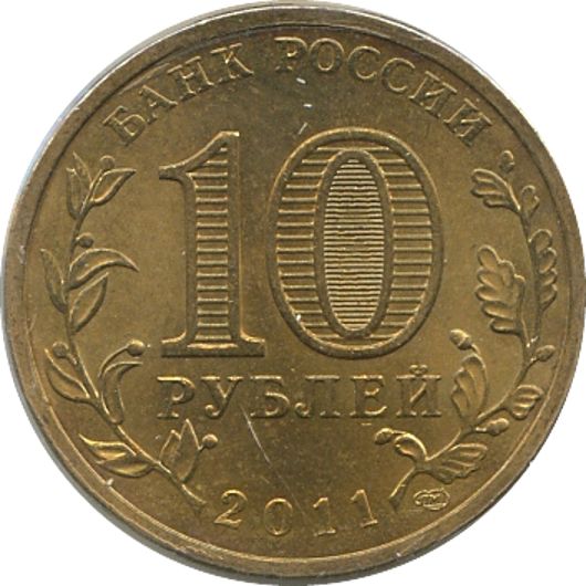 Описание: У центрі диска — позначення номіналу монети «10 РУБЛЕЙ» (10 РУБЛІВ). Усередині цифри «0» — приховані зображення цифри «10» та напису «РУБ» (RUB), які по черзі стають видимими при зміні кута зору. По краю монети - кругові написи, зверху: «БАНК РОССИИ» (БАНК РОСІЇ), знизу - дата: «2011», ліворуч - стилізоване зображення оливкової гілки, праворуч - дубової.