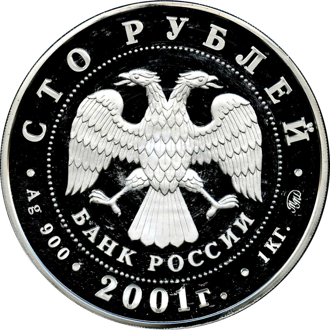 Описание: У центрі — емблема Банку Росії [двоголовий орел з опущеними крилами, нижче — напівкруглий напис — «БАНК РОССИИ» (БАНК РОСІЇ)] в обрамленні кола з крапками та написами по краю: зверху — «СТО РУБЛЕЙ» (СТО РУБЛІВ), внизу — рік випуску «2001», літери ліворуч позначають метал і пробу, праворуч — вміст дорогоцінного металу і знак монетного двору.