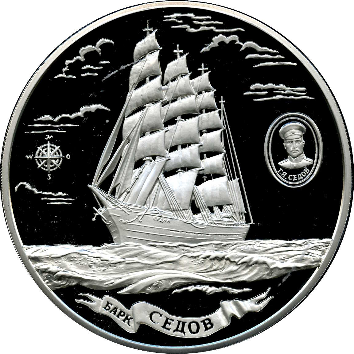Описание: Зображення плавучого барка «Седов», ліворуч — символічне позначення частин світу, праворуч — портрет російського полярного дослідника Г.Я. Седова в овалі з напівкруглим написом «Г.Я. СЕДОВ», внизу — напис на стрічці: «БАРК СЕДОВ» (БАРКА СЕДОВ).