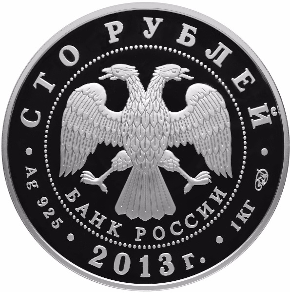 Описание: У центрі — емблема Банку Росії [двоголовий орел із розпростертими крилами, під ним — напівкруглий напис «БАНК РОССИИ» (БАНК РОСІЇ)], обрамлена колом з крапок і написів по краю — зверху: «СТО РУБЛЕЙ» (СТО РУБЛІВ), нижче: ліворуч - позначення дорогоцінного металу та його проби, в центрі - рік випуску «2013 г.» (2013), праворуч - вміст дорогоцінного металу та знак монетного двору.
