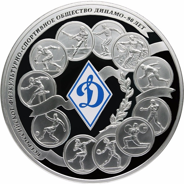 Описание: На дзеркальному полі диска в центрі — синій герб товариства «Динамо», стрічка та лавровий вінок, оточені одинадцятьма круглими медальйонами із зображеннями спортсменів, ліворуч і вгорі на світлій смузі вздовж краю — напис: «ВСЕРОССИЙСКОЕ ФИЗКУЛЬТУРНО-СПОРТИВНОЕ ОБЩЕСТВО ДИНАМО-90 ЛЕТ» (ВСЕРОСІЙСЬКЕ СПОРТИВНЕ ТОВАРИСТВО «ДИНАМО» — 90 РОКІВ).