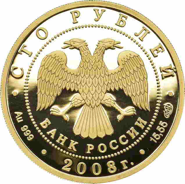 Описание: У центрі — емблема Банку Росії [двоголовий орел із опущеними крилами, під ним — напівкруглий напис «БАНК РОССИИ» (БАНК РОСІЇ)], обрамлена колом з крапок, а по краю — написи: зверху: «СТО РУБЛЕЙ» (СТО РУБЛІВ), нижче: ліворуч - позначення дорогоцінного металу та його проби, в центрі - рік випуску «2008 г.» (2008), праворуч - вміст дорогоцінного металу та знак монетного двору.