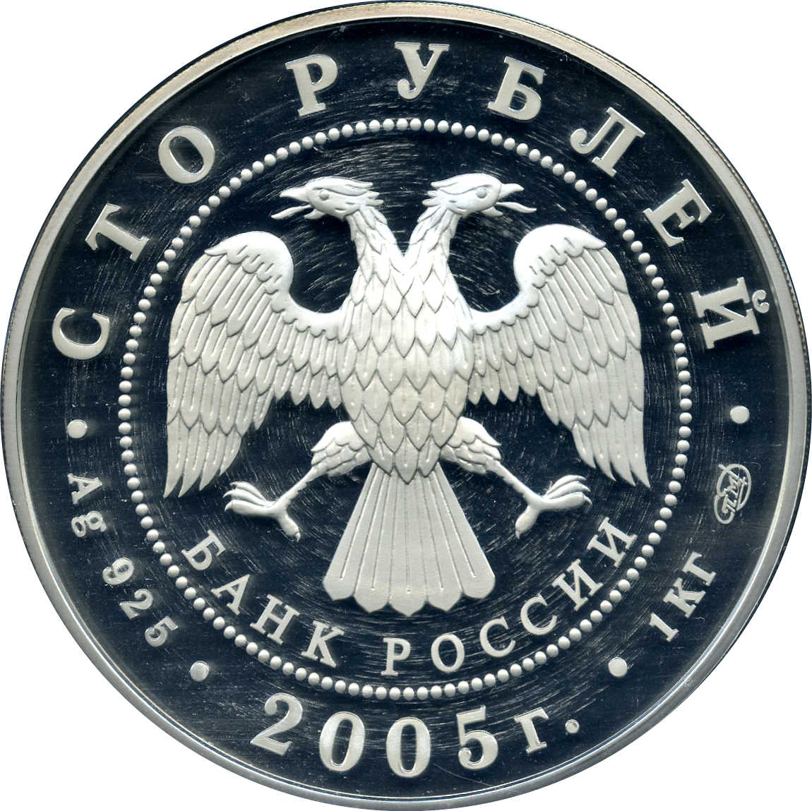 Описание: У центрі — емблема Банку Росії [двоголовий орел з опущеними крилами, нижче — напівкруглий напис — «БАНК РОССИИ» (БАНК РОСІЇ)] в обрамленні кола з крапок і написів по краю: вгорі — «СТО РУБЛЕЙ» (СТО РУБЛІВ), внизу – рік випуску «2005», літери ліворуч позначають метал і пробу, праворуч – вміст дорогоцінного металу і знак монетного двору.