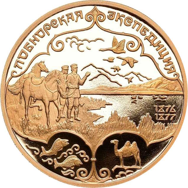 Описание: Зображення учасників експедиції на березі озера, праворуч — дати у двох рядках «1876» «1877», внизу ліворуч — плаваючі риби, праворуч — дикий верблюд. У верхній частині — птахи та напис по краю: «ЛОБНОРСКАЯ ЭКСПЕДИЦИЯ» (ЛОПНОРСЬКА ЕКСПЕДИЦІЯ).