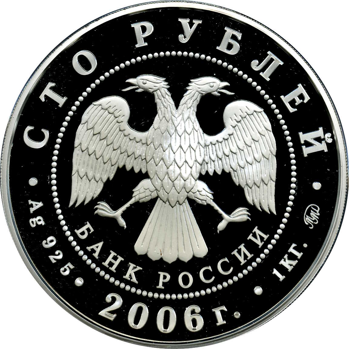 Описание: У центрі — емблема Банку Росії [двоголовий орел зі спущеними крилами, нижче — напівкруглий напис — «БАНК РОССИИ» (БАНК РОСІЇ)] в обрамленні кола з крапок і написів по краю: зверху — «СТО РУБЛЕЙ» (СТО РУБЛІВ), внизу – рік випуску «2006», літери ліворуч позначають метал і пробу, праворуч – вміст дорогоцінного металу і знак монетного двору.