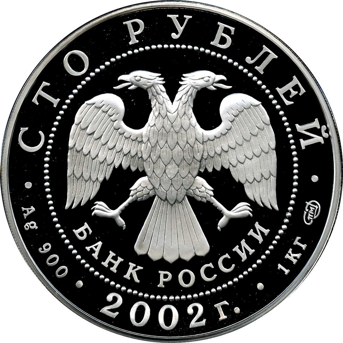 Описание: У центрі — емблема Банку Росії [двоголовий орел із розпростертими крилами, нижче — напівкруглий напис «БАНК РОССИИ» (БАНК РОСІЇ)], обрамлена колом з крапок і написів по краю: зверху «СТО РУБЛЕЙ» (СТО РУБЛІВ), внизу - рік випуску «2002», літери ліворуч позначають метал і пробу, праворуч - вміст дорогоцінного металу і знак монетного двору.