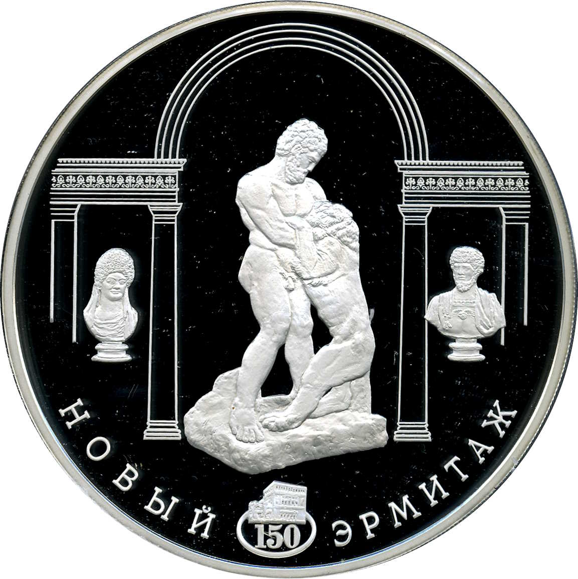 Описание: У центрі — статуя «Геракл, що бореться з левом» (римська копія I—II століть за оригіналом грецького скульптора Лісіппа, друга половина IV століття до н. е.), ліворуч — бюст Доміції Лонгіни, дружини римського імператора Доміціана I (I–II століття), праворуч – бюст римського імператора Луція Вера (II століття), внизу по краю напис: «НОВЫЙ ЭРМИТАЖ» (НОВИЙ ЕРМІТАЖ), розділений датою «150» в овалі, над датою – будівля Нового Ермітажу.