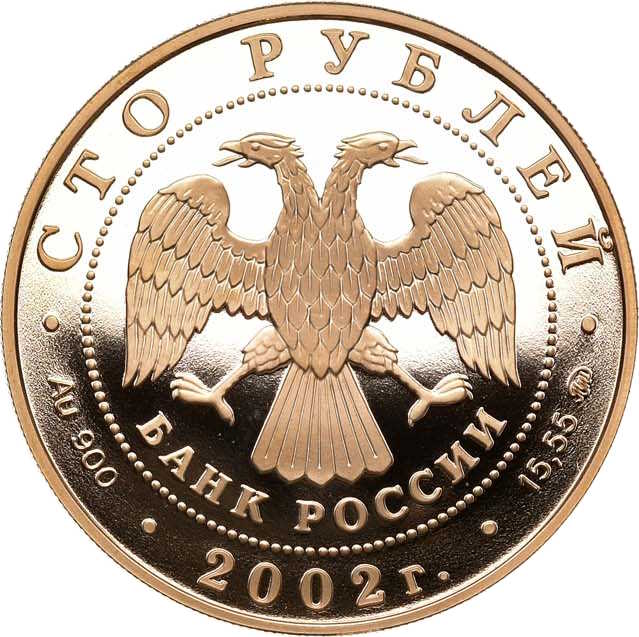 Описание: У центрі — емблема Банку Росії [двоголовий орел із опущеними крилами, нижче — напівкруглий напис «БАНК РОССИИ» (БАНК РОСІЇ)] в обрамленні кола з крапок і написів по краю: зверху — «СТО РУБЛЕЙ» (СТО РУБЛІВ), внизу - рік випуску «2002», літери ліворуч позначають метал і пробу, праворуч - вміст дорогоцінного металу і знак монетного двору.