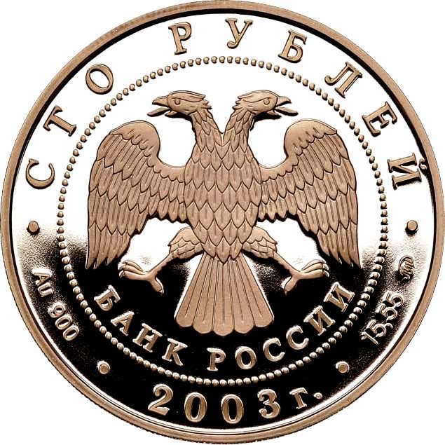 Описание: У центрі — емблема Банку Росії [двоголовий орел із опущеними крилами, нижче — напівкруглий напис «БАНК РОССИИ» (БАНК РОСІЇ)] в обрамленні кола з крапок і написів по краю: зверху — «СТО РУБЛЕЙ» (СТО РУБЛІВ), внизу — рік випуску «2003», літери ліворуч позначають металевий знак і пробу, праворуч — вміст дорогоцінного металу та торговельну марку монетного двору.