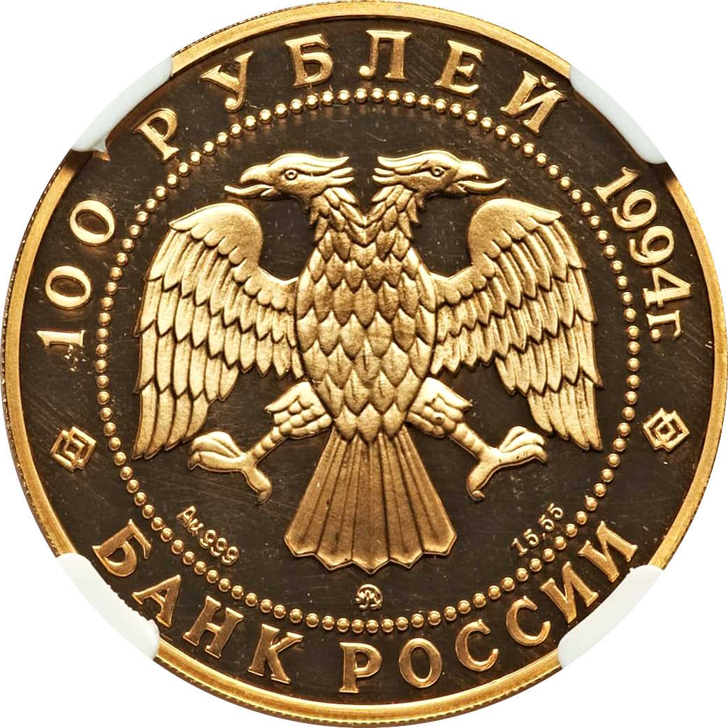 Описание: Двоголовий орел (дизайн І. Білібіна), літери під ним позначають метал, пробу, знак монетного двору та вміст дорогоцінного металу. Написи по краю: зверху — «100 РУБЛЕЙ 1994 г.» (100 РУБЛІВ 1994), знизу — «БАНК РОССИИ» (БАНК РОСІЇ).