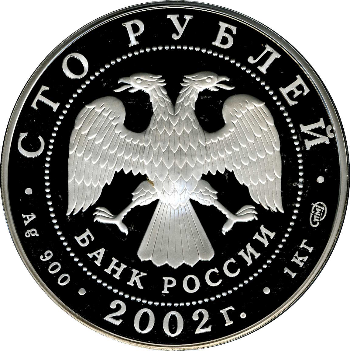 Описание: У центрі — емблема Банку Росії [двоголовий орел із опущеними крилами, нижче — напівкруглий напис «БАНК РОССИИ» (БАНК РОСІЇ)] в обрамленні кола з крапок і написів по краю: зверху — «СТО РУБЛЕЙ» (СТО РУБЛІВ), внизу — рік випуску «2002», літери ліворуч позначають метал і пробу, праворуч — вміст дорогоцінного металу та знак монетного двору.