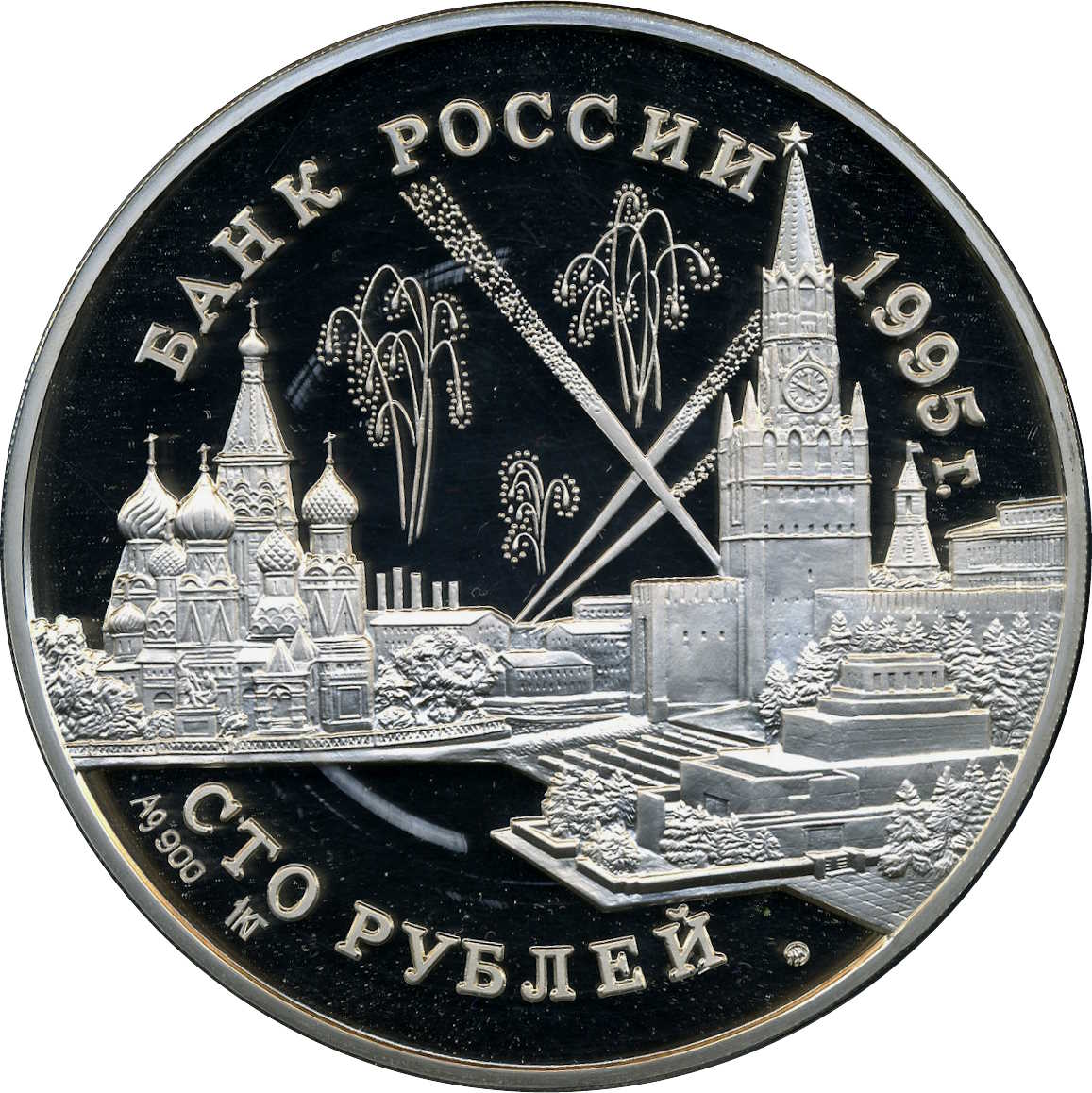 Описание: Панорамний вид на Червону площу Москви з Мавзолеєм Леніна та Спаською вежею Московського Кремля, на передньому плані — Собор Покрова на Рові (Собор Василя Блаженного) та феєрверки в небі, освітлені прожекторами, ліворуч внизу — металевий знак, проба, вміст дорогоцінного металу, праворуч — торгова марка монетного двору. Написи по краю: вгорі — «БАНК РОССИИ» (БАНК РОСІЇ), внизу — «СТО РУБЛЕЙ 1995 г.» (СТО РУБЛІВ 1995).