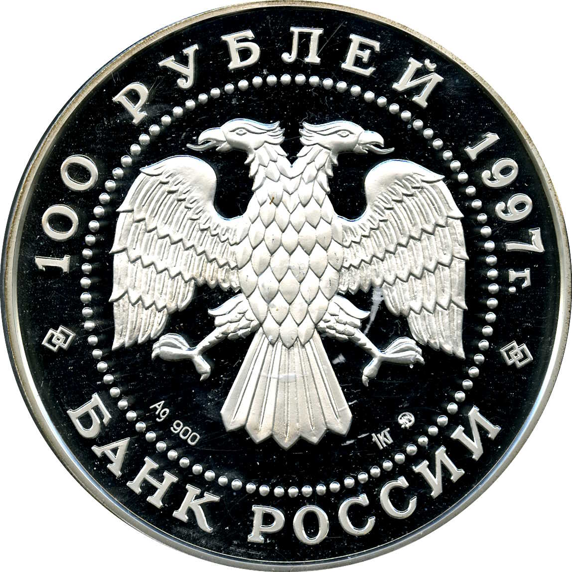 Описание: Двоголовий орел, створений художником І. Білібіним. Написи по краю: зверху — «100 РУБЛЕЙ 1997 г.» (100 РУБЛІВ 1997), знизу — «БАНК РОССИИ» (БАНК РОСІЇ). Літери нижче позначають метал, пробу, вміст дорогоцінного металу та знак монетного двору.