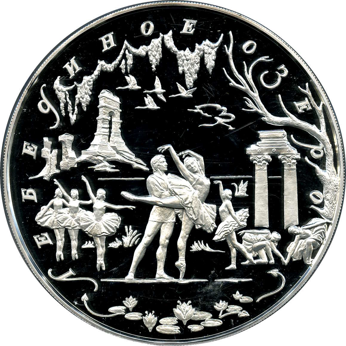 Описание: Зустріч Зігфріда та Одетти на озері в першому акті. Напис по краю: «ЛЕБЕДИНОЕ ОЗЕРО» («ЛЕБЕДИНЕ ОЗЕРО»).