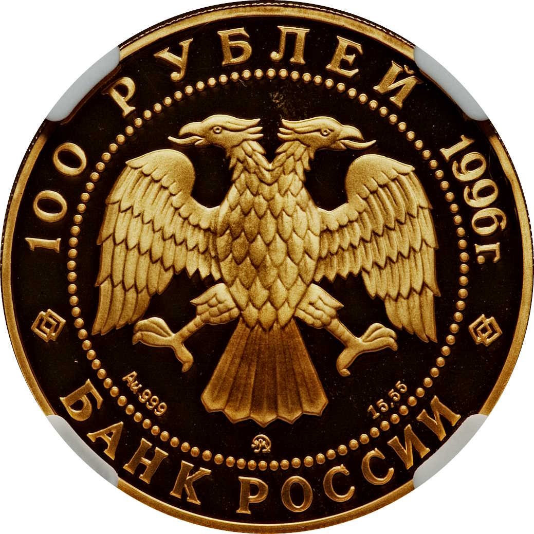 Описание: Двоголовий орел, створений художником І. Білібіним. Написи по краю: зверху — «100 РУБЛЕЙ 1996 г.» (100 РУБЛІВ 1996), знизу — «БАНК РОССИИ» (БАНК РОСІЇ). Літери нижче позначають метал, пробу, знак монетного двору та вміст дорогоцінного металу.