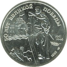 Описание: Вид на пам'ятник визволителю (радянському солдату) у берлінському парку Трептов (створений скульптором Євгеном Вутечичем та архітектором Яковом Белопольським) на тлі будівлі Рейхстагу та поваленого орла, символу фашистської Німеччини, праворуч — дві дати у двох рядках «1941» та «1945», лаврову гілку, знак монетного двору та рік карбування «1995 г.», напис у верхній частині вздовж краю - «50 ЛЕТ ВЕЛИКОЙ ПОБЕДЫ» (50-РІЧЧЯ ВЕЛИКОЇ ПЕРЕМОГИ).